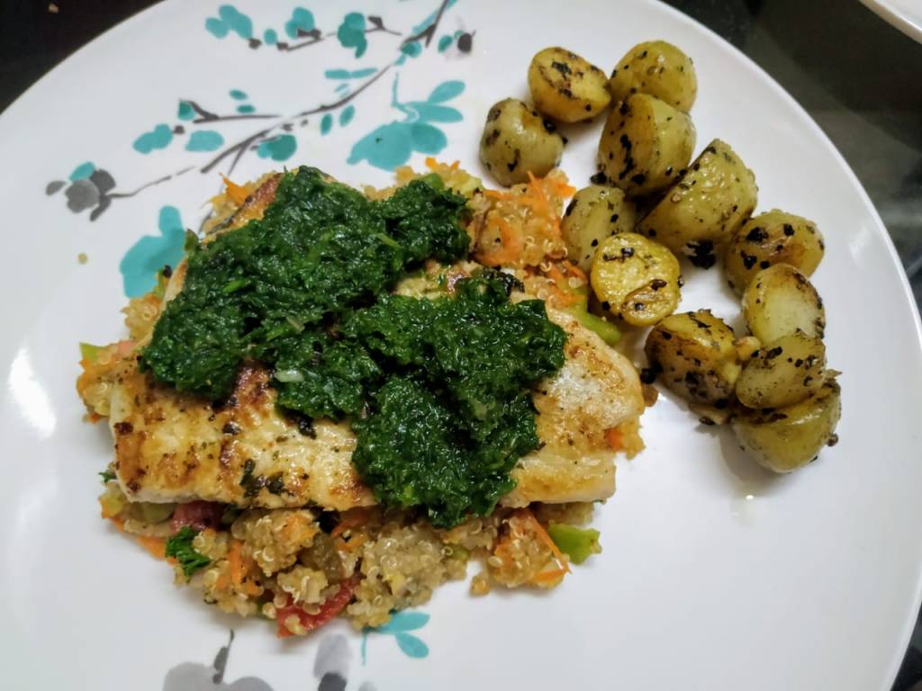 Quinoa salad, grilled fish with chimichurri sauce and pan-fried potatoes